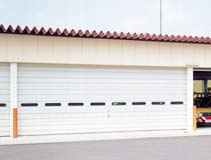 | カラーアルミ板をパネル表面材に使用しました。大間口でも手動で開閉でき、明かり窓を組み込むことができるなど、すぐれた機能性で省エネ効果を発揮します。 | |